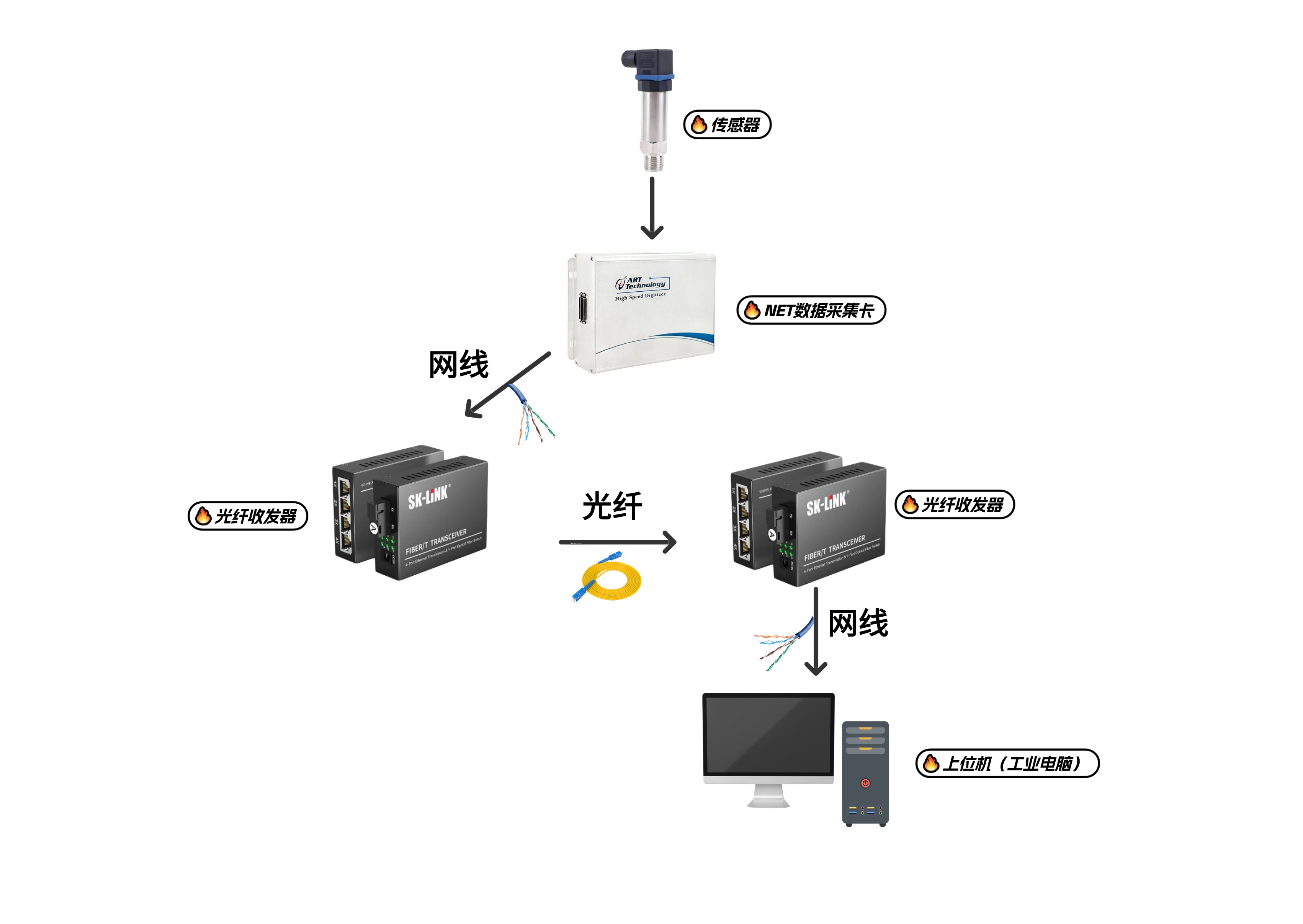 光纖收發(fā)器:現(xiàn)場端收發(fā)器將采集卡輸出的電信號轉(zhuǎn)換為光信號。中控室端收發(fā)器將光信號還原為電信號,實現(xiàn)光電無縫轉(zhuǎn)換。